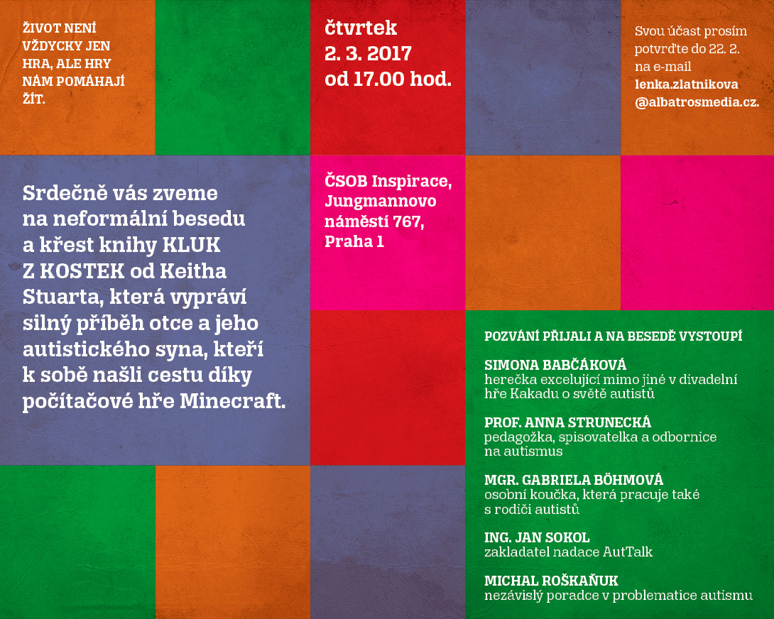 Beseda u příležitosti vydání knížky Kluk z kostek. Ve čtvrtek 2. března proběhla v ČSOB Inspirace beseda u příležitosti vydání knížky Kluk z kostek. Besedy se zúčastnili (v abecedním pořadí) koučka a terapeutka Gabriela Boehmová, zakladatel společnosti Adventor Michal Roškaňuk, předseda správní rady NF AutTalk Jan Sokol, profesorka a spisovatelka Anna Strunecká a herečka Simona Babčáková, která v Dejvickém divadle hraje v představení o autismu Kakadu. V úvodu přečetla Simona Babčáková úryvek z prvního romána Keitha Stuarta, novináře, který příběh Alexe napsal na základě své osobní zkušenosti, a pak už následovala dlouhá debata o tom, jací mohou být autisté, jací naopak docela určitě nejsou a kde se autismus bere. V závěru debaty přítomní knížku pokřtili a popřáli ji štastnou cestu ke čtenářům. Za krásné fotografie děkujeme Dana Kriso Knížku si můžete koupit i v našem e-shopu.